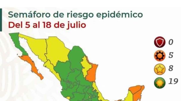 De esta forma, del 5 al 18 de julio, 19 entidades federativas se mantendrán en el color verde de riesgo bajo por covid-19.