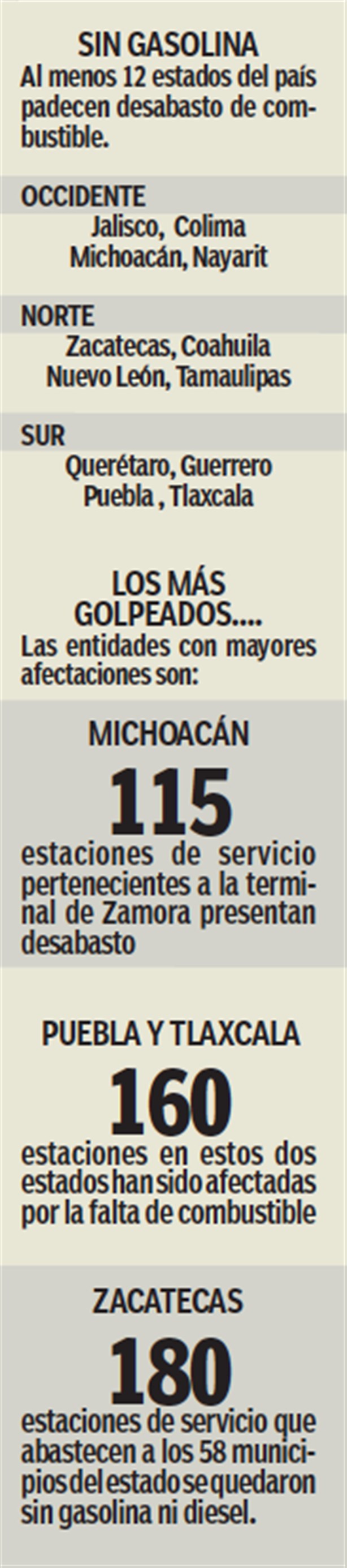 El mismo padecimiento lo tienen los estados de Colima, Jalisco y Nayarit, en donde durante este fin de semana las gasolineras reportaron desabasto tanto de Magna como Premium y Diesel.