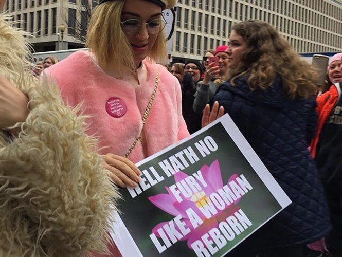 La cantante Katy Perry caminó entre la multitud, acompañada por su hermana Angela, pero no dio ningún discurso en público.