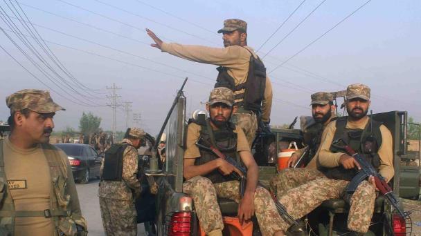 MOVILIZACION. Tropas paquistaníes salen tras un tiroteo con militantes en las afueras de Peshawar, Pakistán, el sábado.