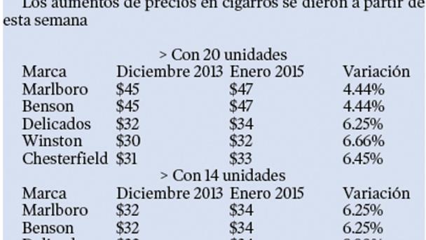 El incremento más grande se dio en la cajetilla con 14 unidades de la marca Winston, que pasó de 20 a 22 pesos, un 10 por ciento más.