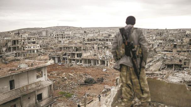 También si ha sobrevivido a los ataques algo de la vieja sintaxis, si se puede todavía caminar por el interior de esos agujeros reconociendo los dormitorios o el cuarto baño, si entre los cascotes palpitan fotografías de los álbumes familiares, instantáneas de las bodas, de las celebraciones, de los rostros de los recién nacidos… El miliciano kurdo del primer plano de la imagen, que observa desde una azotea el panorama, ¿se preguntará si habrá hallado refugio en algún sitio la población civil que en otro tiempo llevaba allá abajo una vida normal, si hay vidas normales? ¿Abandonaron la ciudad siria de Kobane, que así se llamaba, con sus colchones y sus sartenes a cuestas? ¿Qué fue de sus ancianos, de sus bebés, de sus embarazadas, de sus jóvenes? Al miliciano le devuelven la mirada cientos o miles de boquetes oscuros que recuerdan las cuencas de los ojos vaciadas cruelmente a cuchara.