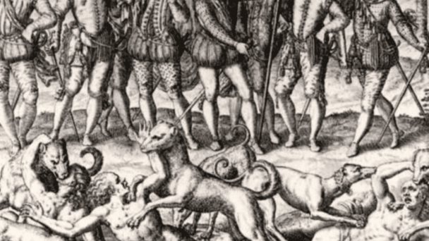 Un conocido grabado de Theodore de Bry (1528-1598) sobre la leyenda negra española y la conquista de América.