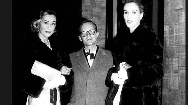 Jean Murray Vanderbilt y Barbara Babe Paley, dos de los cisnes de Capote, con el escritor en 1957.