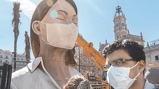 La falla de la Plaza del Ayuntamiento, de Valencia cubierta con una mascarilla, el pasado marzo.