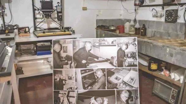 El cuarto oscuro queda al fondo de la casa, antes de su taller de enmarcado. Una estantería colmada de frascos llenos de químicos para el revelado domina una de las paredes, los tesoros olvidados del alquimista. Del lado contrario, sobre una mesa, yace una máquina de revelado platino/paladio, un armatoste con forma de horno, muy usado hasta mediados del siglo pasado.