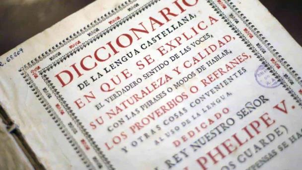 Portada del Primer tomo (1726) del Diccionario de autoridades de la Real Academia de la Lengua,el primer diccionario confeccionado por la RAE.
