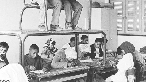 Como no nos parece que esta arquitectura peligrosamente piramidal sea una respuesta a la falta de espacio, y en ausencia de otras explicaciones, tenemos, una vez más, que buscarnos la vida. Ahora bien, que nos la busquemos no quiere decir que la hallemos. Y esto es lo que nos sucede aquí, que no tenemos ni idea de lo que pasa, ni siquiera de lo que nos pasa al asomarnos a la imagen. Está la turbación, de acuerdo, sí: nos desconcierta, nos confunde, incluso nos deslumbra, pero nos deja mudos, impotentes, nos inhabilita para ir más allá de la mera descripción de lo que ven los ojos. ¿Se tratará quizá de un método pedagógico? Y de ser así, ¿con qué criterio se selecciona a los alumnos de las alturas? ¿Serán los mejores, los peores, los que todavía se hacen pis en la cama? Todo son preguntas.