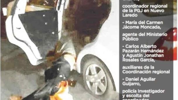 Hombres armados rafaguearon con armas calibre 50 el vehículo en que se trasladaban los elementos estatales en el cruce de las avenidas Eva Sámano y Municipio Libre de Nuevo Laredo. Los cuatro hombres murieron inmediatamente y la agente del Ministerio Público, María del Carmen Jácome Moncada, quedó herida y falleció posteriormente.
