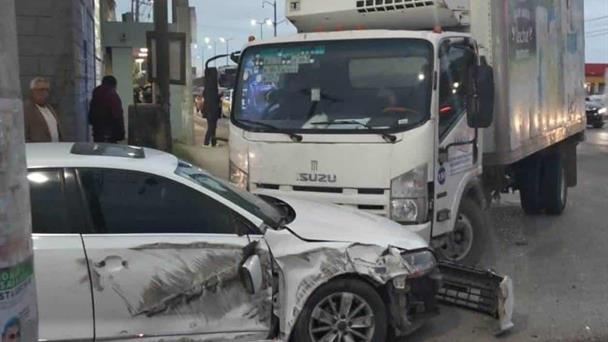 Un camión de volteo impactó a un vehículo Volkswagen Jetta, color blanco, el cual salió proyectado contra otro camión