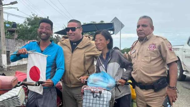 Este jueves, la pareja de ciclistas japoneses pasó por la zona sur de Tamaulipas.