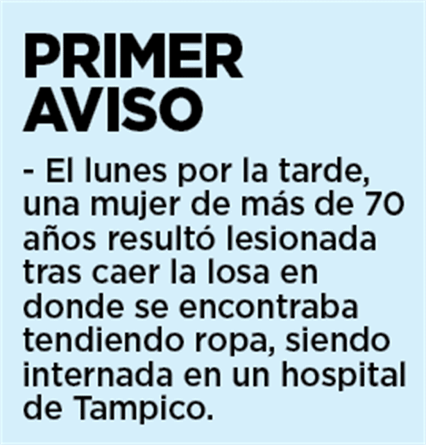 Altamira, Tam.- "Auxilio, auxilio", gritaba la anciana que se desplomó con todo y losa de su casa en el fraccionamiento Santa Elena; sigue internada en condición grave, dijo una de sus vecinas, que reiteró que el conjunto habitacional de interés social está en pésimo estado.
