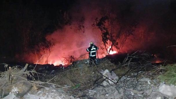 Bomberos extinguen las llamas de una quemazón de basura en un sitio clandestino a orillas del rio San Juan.