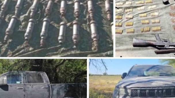 Ejército Mexicano decomisa vehículos, armas, cartuchos y explosivos en Camargo.