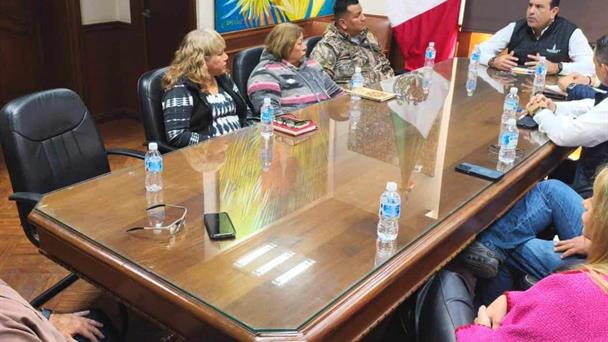 Por instrucción del alcalde Eduardo Gattás Báez, el secretario del Ayuntamiento Hugo Reséndez Silva presidió la reunión de colaboración en la que estuvo presente Livio Flores Rodríguez, coordinador de Protección Civil, Luis Peláez, de la Mesa de Seguridad Municipal, y José Hernández Cuesta, de Participación Ciudadana.
