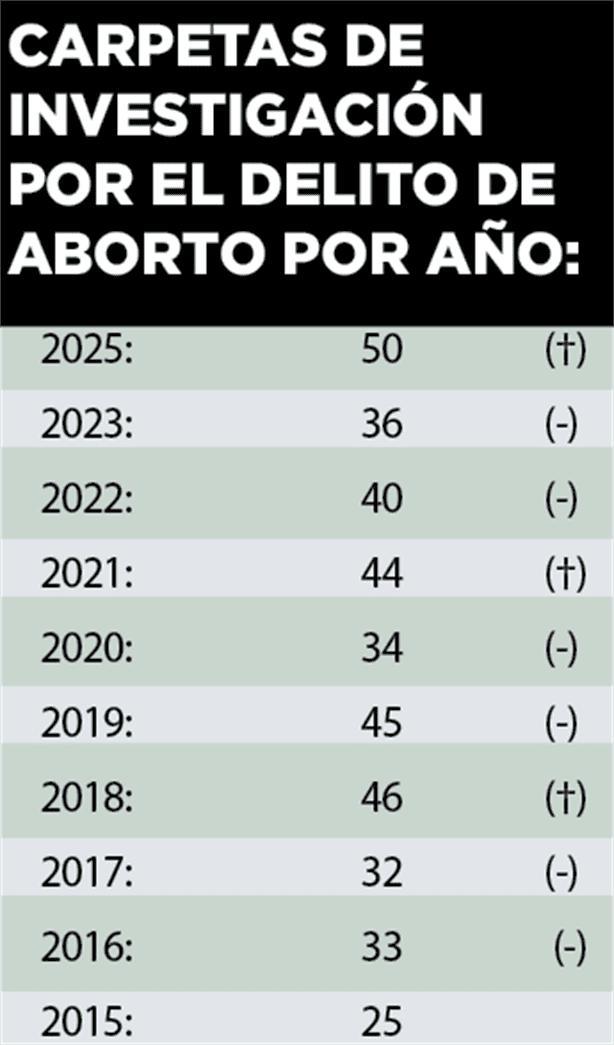 Para octubre del 2024, se registraron 50 carpetas de investigación por el delito de aborto, siendo la cifra más alta desde que se tiene registro de la incidencia delictiva.