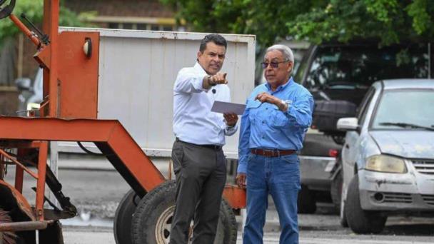 Para evaluar los avances en la rehabilitación del pavimento asfáltico que se realiza en la calle 6 Ceros, entre Guerrero y Bravo, el alcalde Eduardo Gattás Báez recorrió la superficie de rodamiento en compañía del secretario de Obras Públicas, Eusebio Alfaro Reyna.