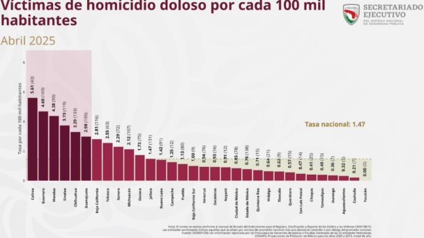 De acuerdo al último reporte del Secretariado Ejecutivo del Sistema Nacional de Seguridad Pública, Tamaulipas se colocó entre las primeras cinco entidades federativas con menor tasa de víctimas por homicidios dolosos por cada 100 mil habitantes, con apenas 0.40%, y por debajo de la media nacional de 1.47% al mes de abril de 2025.
