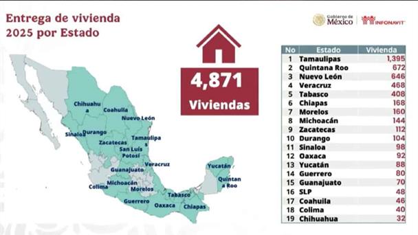 "Aquí están los estados donde vamos a entregar estas 4 mil 871 viviendas; por ejemplo en Tamaulipas vamos a entregar mil 395, ya estamos entregando, vamos a llegar a ese número, en todos estos ya estamos entregando, casi en todo", precisó, al tiempo de mostrar los avances de las viviendas edificadas en Reynosa y en Ciudad Victoria.