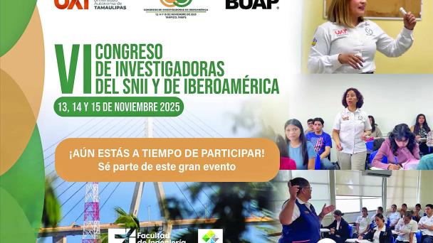 La Universidad Autónoma de Tamaulipas (UAT), en colaboración con la Benemérita Universidad Autónoma de Puebla (BUAP) y el Consejo Tamaulipeco de Ciencia y Tecnología (Cotacyt), convocan al VI Congreso de Investigadoras del Sistema Nacional de Investigadoras e Investigadores (SNII) y de Iberoamérica 2025, que tendrá lugar del 13 al 15 de noviembre en la sede de la Facultad de Ingeniería Tampico.
