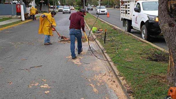 Personal de Protección Civil, Parques y Jardines de Servicios Públicos y Desarrollo Urbano, realizaron trabajos de poda y retiro de árboles caídos en la calle 7 Ceros Hidalgo y Juárez; avenida 24, calle Esmeralda de la colonia Loma Alta y 9 y 10 Canales de la colonia Mainero.