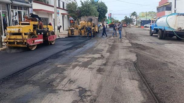 Tras la restitución de 900 metros de red central y tomas domiciliarias de agua potable por parte de COMAPA y nivelación de superficie, cuadrillas de la secretaría de Obras Públicas del Municipio iniciaron la aplicación de nueva carpeta asfáltica en los 12,743 metros cuadrados proyectados a restituir.
