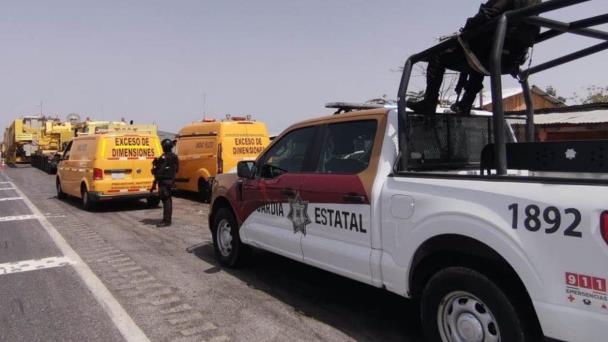 González, Tamaulipas.- Se registra tráfico lento en el kilómetro 04 de la Carretera Federal 80, en el libramiento Manuel - González, por el traslado de vehículos con exceso de dimensiones que transportan un transformador de energía hacia una subestación en Monterrey, Nuevo León.