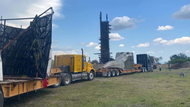 En esta primera etapa llegaron tres tráileres con piezas de la estructura; en total serán 12 los que transporten la obra hasta el cerro cercano a la cascada del santuario donde quedará instalada.