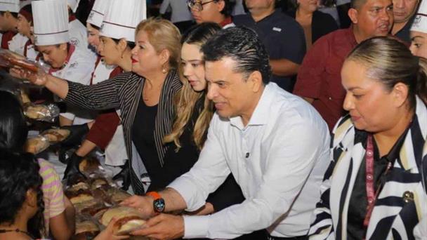 En compañía de la directora del plantel, Adriana Lizbeth Cerda Lerma, y presidentes de cámaras empresariales, compartieron el tradicional pan de la temporada entre sonrisas, abrazos y alegría de niños, jóvenes y adultos que se dieron cita en la explanada del Paseo Méndez.