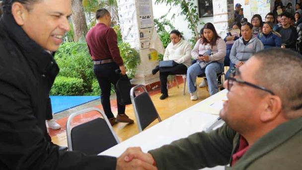 En visita a los módulos de empleo instalados en la Presidencia Municipal, dialogó con las personas que asistieron a solicitar uno de los 100 puestos laborales que brindan la maquiladora Kemet y Distribuidora de Víveres.