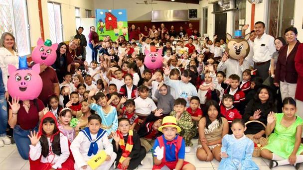Con el apoyo de la Dirección de Educación, se llevó a cabo la presentación novedosa y dinámica del cuento de "Los Tres Cochinitos" que incluyó la participación de personajes alusivos al cuento, motivando la participación de niñas y niños de manera interactiva.