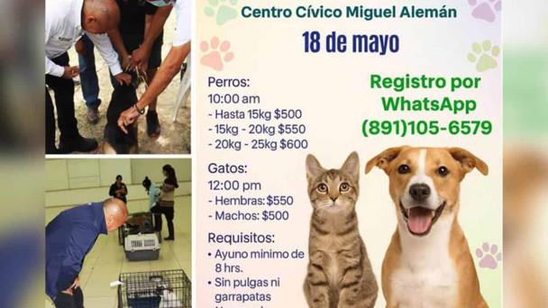 Campaña de Esterilización está programada para este domingo 18 de mayo en el Centro Cívico de Miguel Alemán.