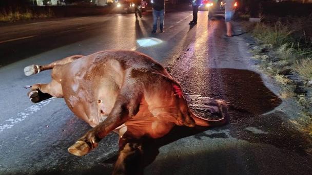 A través de los números de emergencia, las autoridades recibieron el llamado del accidente en donde dos unidades motrices resultaron con daños materiales cuantiosos, luego de impactar una vaca que se encontraba atravesada en la cinta asfáltica.