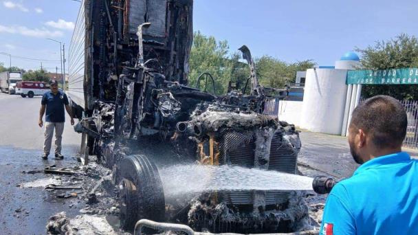 Un tractocamión de carga pesada fue consumido en su totalidad por un voraz incendio que se originó debido a la supuesta explosión de la batería.