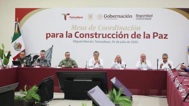 Miguel Alemán, Tam.– El gobernador Américo Villarreal visitó este jueves el municipio de Miguel Alemán, donde encabezó una reunión de la Mesa de Coordinación para la Construcción de la Paz en Tamaulipas, acompañado por alcaldes y alcaldesas de la zona fronteriza.