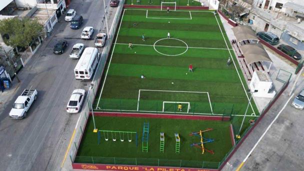 Uno de los espacios rehabilitados corresponde al área deportiva ubicada en la intersección de las calles Valdez Reyna y Patricio Chirino, en la colonia Nueva Era, donde el Gobierno Municipal destinó una inversión de 2 millones 934 mil 574 pesos con una intervención en una superficie de 4 mil 800 metros cuadrados.
