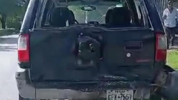 La colisión dejó la camioneta Isuzu negra con placas de Texas gravemente dañada.