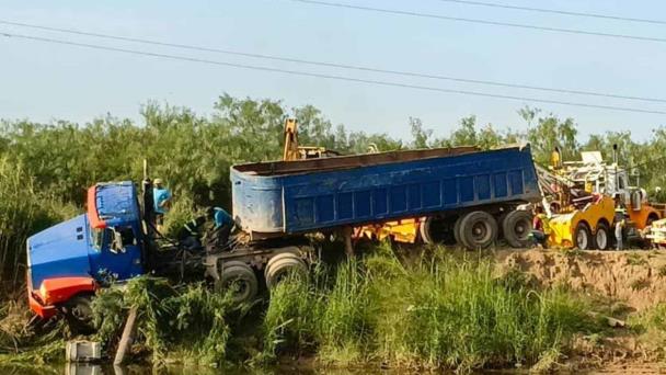 Operador de camión calichero se precipitó a las aguas del canal Anzaldúas al amanecer de este sábado 31 de mayo, quedando semi-sumergido en ese peligroso caudal.