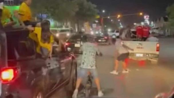 Un hincha que proviene del grupo de americanistas, quien porta camiseta blanca, lanza un líquido no identificado contra los seguidores del Toluca que viajan en una camioneta pick up de la marca GMC, color blanco.