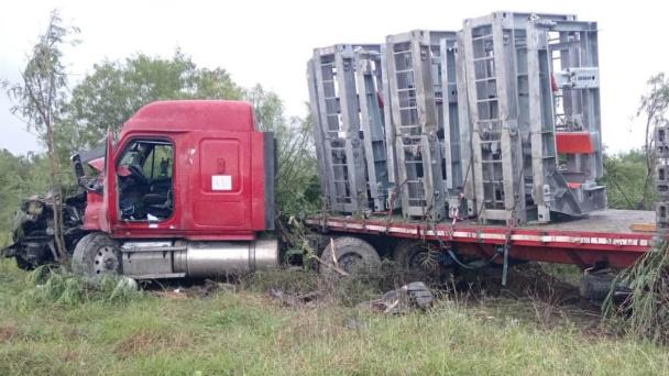 Río Bravo, Tam.- Aparatoso accidente fue protagonizado por conductor de tractocamión, el cual, por la humedad en la carretera, derrapó y salió de la vía de circulación.