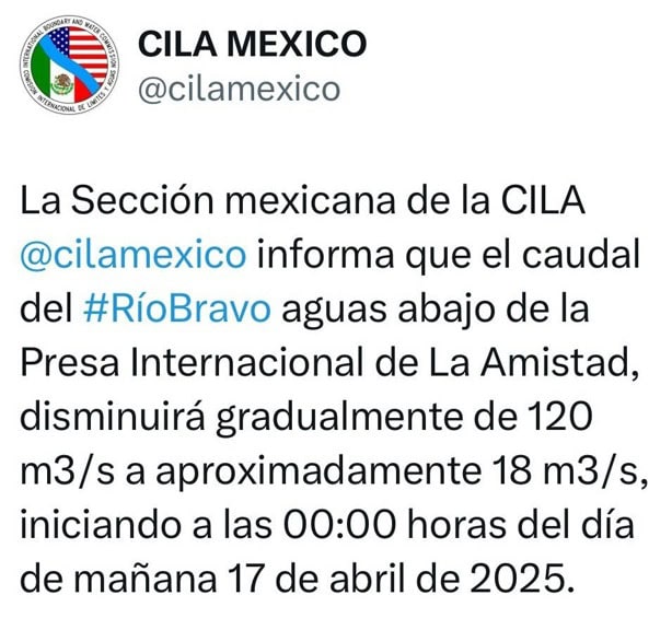 "La Sección mexicana de la CILA @cilamexico, informa que el caudal del #RíoBravo aguas abajo de la Presa Internacional de La Amistad, disminuirá gradualmente de 120 m3/s a aproximadamente 18 m3/s, iniciando a las 00:00 horas del día de mañana 17 de abril de 2025", fue el mensaje oficial de la instancia binacional en su cuenta oficial de X.