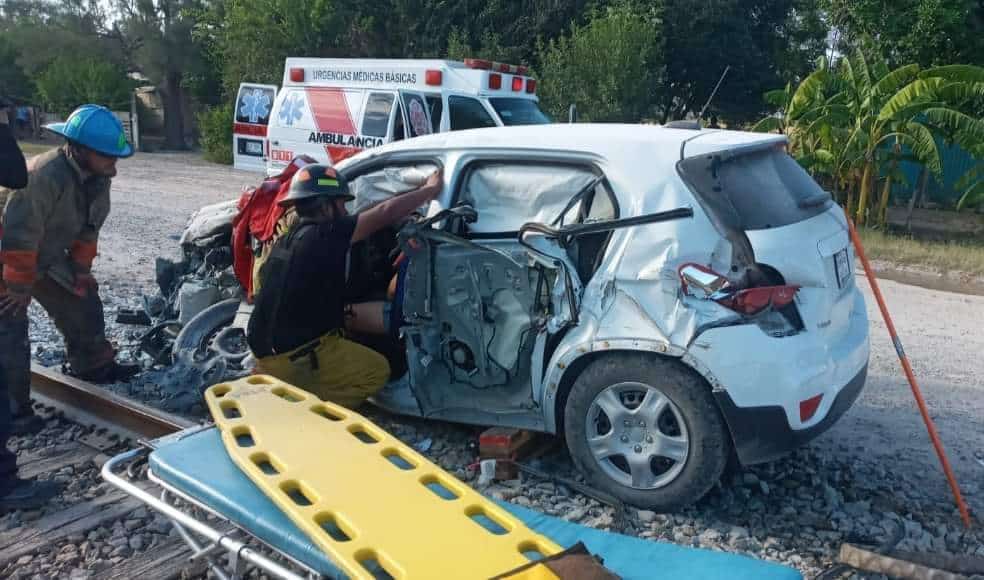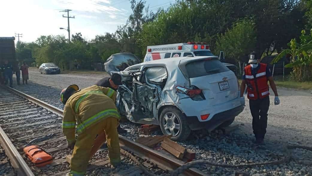 Protección Civil atendió a la conductora de vehículo embestido por el tren en ese cruce ferroviario por la mañana alrededor de las 08:10 horas.