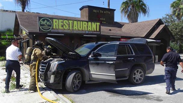 Camioneta de la línea Cadillac se salvó de ser consumida por corto eléctrico la tarde del miércoles en estacionamiento.