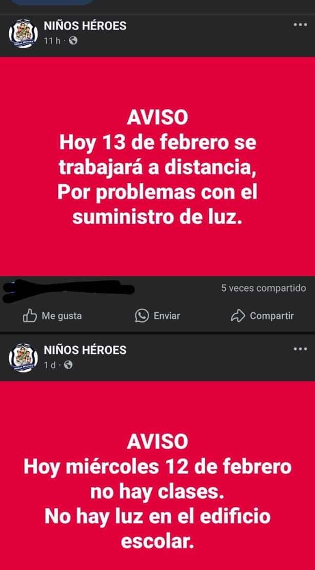 "En la primaria Niños Héroes, de la Monterreal, no hay luz desde el miércoles y sin clases; no nos han informado más ni hay comunicación. Hay padres que tenemos que salir a trabajar temprano y mandamos en transporte a los niños y estamos con el pendiente porque no nos informan con tiempo hasta las 7 y feria de la mañana, cuando el transporte ya pasó por ellos.