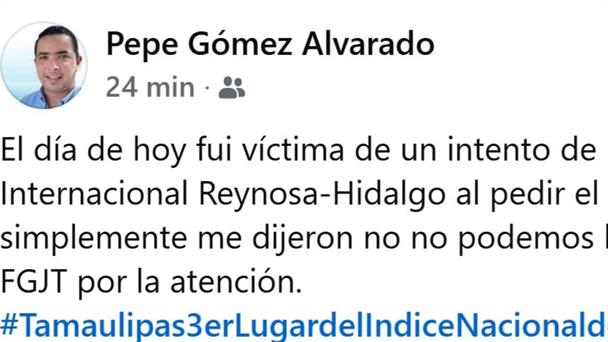 'El día de hoy fui víctima de un intento de plagio en el Puente Internacional Reynosa-Hidalgo al pedir el apoyo a la Guardia Nacional simplemente me dijeron no, no podemos hacer nada, agradezco a la FGJT por la atención', fue el mensaje de Gómez. El incidente tuvo en realidad verificativo poco después del mediodía, dijo en breve entrevista.