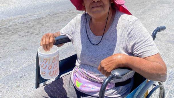 Con el sol a tope, y temperaturas que oscilan con una sensación térmica entre los 40 a los 42 grados centígrados, mujer discapacitada expone su integridad física en plena avenida ejerciendo la mendicidad al no verse favorecida por ningún programa federal.