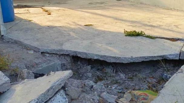 La acera de una gruesa capa de concreto cedió al socavado del suelo por razones que no se han determinado