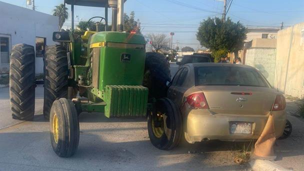 Igualmente el tractor de la marca John Deere se estrelló en un auto Chevrolet Malibú, color arena y placas de Texas que estaba estacionado.