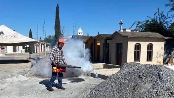 Personal del departamento de vectores, adscritos al Distrito de Salud para el Bienestar No. VII, redoblaron las actividades de fumigación en los cementerios de la mancha urbana y comunidades rurales.