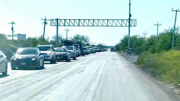 La fila de vehículos ligeros, de transporte de pasajeros y tráileres, supera los 11 kilómetros de sur a norte, llegando la columna de unidades de fuerza motriz hasta el libramiento del ejido Francisco Villa del municipio de San Fernando.
